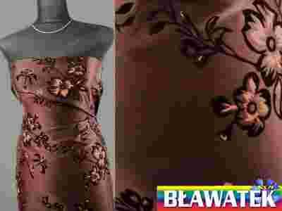 Przedmiotem aukcji jest piękna satyna w czekoladowym kolorze z flokiem. Tkanina jest delikatna, bardzo miła w dotyku, ładnie się nosi i układa, delikatnie połyskująca, delikatnie elastyczna.