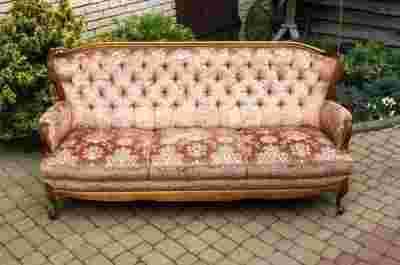 PIĘKNA TAPICEROWANA SOFA !!!!!!! Sofa trzyosobowa – tapicerka oryginalna z wytłaczanego pluszu, w kwiaty - kolor jak na zdjęciu. Boki oraz tył tapicerowane ,bez uszkodzeń. Całość konstrukcji lakierowana w ciemnym kolorze. Tapicerka w stanie bardzo dobrym bez przetarć i zaplamień. !!! Aukcja dotyczy samej sofy !!!!!!! Możliwość dokupienia jednego fotela , zainteresowanych proszę o kontakt telefoniczny 722 [zasłonięte] 662
