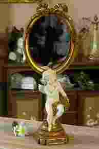 Wysokie, stojące, owalne lustro z aniołkiem w stylu barokowym.