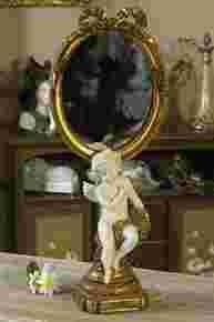 Wysokie, stojące, owalne lustro z aniołkiem w stylu barokowym.