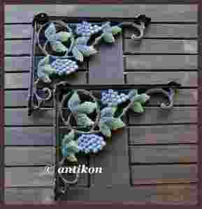 Wspaniały komplet dwóch wsporników w stylu secesyjnym. Wsporniki wykonane są z żeliwa. Ozdobione prześlicznym motywem winorośli w formie wijących się gałązek z liśćmi oraz kiści owoców. Wsporniki można zamontować z obu stron. Świetnie się prezentują i będą cudownym akcentem wystroju każdego pomieszczenia. Wsporniki są bardzo dekoracyjne a zarazem to przedmioty niezwykle praktyczne i funkcjonalne. Stan bardzo dobry, bez uszkodzeń.