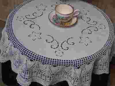 PIĘKNY BAWEŁNIANY OBRUS Z KORONKĄ HAFTAMI