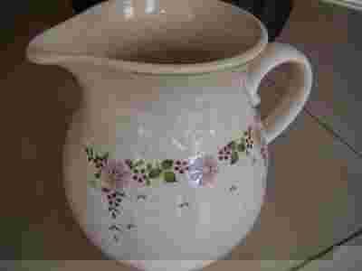 WYTWÓRCY/FIRMY>> POJEMNOŚĆ 1,1 LITRA >>KOLOR ECRU,W GÓRNEJ CZĘŚCI MALOWANY WIANUSZEK Z KWIATÓW.