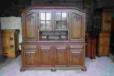 Stan mebli widoczny na zdjęciach, konstrukcja stabilna. Niewielkie ślady użytkowania. Kredens wszystkie fronty ma z drewna dębowego a boki i półki wykonane są z płyty okleinowanej naturalną okleiną.