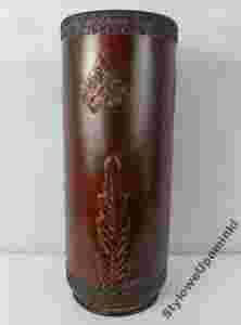 Wysoki parasolnik wykonany z metalu w odcieniu miedzianym, patynowany - stylizowany na stary; masywny, ozdobiony tłoczonym wzorem.