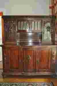 Kredens wykonany jest prawdopodobnie z drzewa orzechowego, pięknie rzeźbiony, na drewnianych nóżkach, górna część przeszklona szybkami.