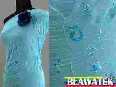 Przedmiotem aukcji jest piękny błękitny szyfon z haftowanym wzorem i drobnymi cekinami. Tkanina jest, zwiewna, delikatna, prześwitująca, miła w dotyku, ładnie się nosi i układa.