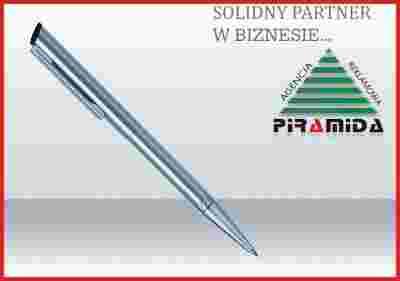 Elegancki długopis z pieczątką. Cała oprawa wykonana jest z metalu, kolor: chrom. Końcówka, uchwyt, wykończenie chromowane. Wkład piszący "Parker System".
