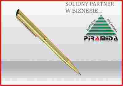 Elegancki długopis z pieczątką. Cała oprawa wykonana jest z metalu, kolor: złoty grawerowany. Końcówka, uchwyt, wykończenie pozłacane. Wkład piszący "Parker System".