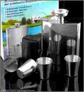 Zestaw w całości wykonany ze stali nierdzewnej także na pewno się nie zbije ani zardzewieje, kieliszki umieszczone w skóropodobnym etui (mieszku) zapinanym na zatrzask. Etui ma możliwość zaczepienia do paska dzięki czemu możemy je swobodnie nosić bez konieczności zajmowania kieszeni i są zawsze pod ręką. Zestaw doskonale nadaje się na plenerowe wypady, na ryby, na grzyby, do pociągu, na wakacje czy na działeczkę lub na oryginalny prezent. Pojemność kieliszków ok 30-35 ml czyli akurat na jednego :-) piersiówki ok 210 ml. czyli ćwiarteczka :-)