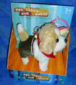 Podpięcie smyczy umożliwia włączanie/ wyłączanie pieska. Zabawka na baterie. Wzory do ew. wyboru jak na zdjęciach powyżej. Długość zabawki 15cm. Długość opakowania: 25x26cm.