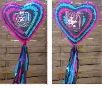 Mam do zaoferowania ręcznie wykonaną pinatę z ekologicznych materiałów w kształcie serca MONSTER HIGH w zestawie tematyczny kij do rozbijania w kolorach pinaty.