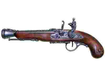 Prezentowany pistolet skałkowy to nowa replika garłacza, jakim posługiwali się piraci w XVIII wieku. Charakterystyczna mosiężna lufa rozszerzona przy wylocie ułatwiająca ładowanie na morzu oraz, jak wierzono, zwiększająca rozrzut śrutu.