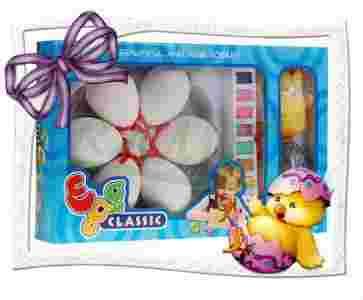Macie do dyspozycji 6 gładkich jajek, zestaw 8 kolorowych farbek wraz z pędzelkiem, podświetlane jajko z dźwiękami oraz maskotkę kurczaka.