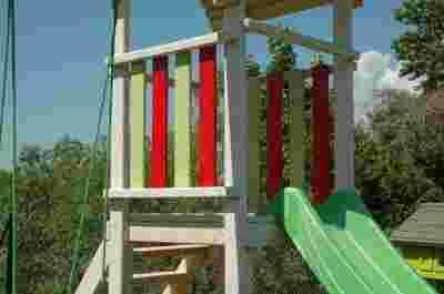 Złożony z: 2 huśtawek pojedynczych, Zjeżdżalni, Domku, Piaskownicy