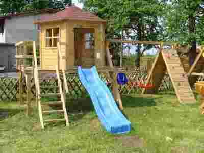 Złożony z: 2 huśtawek pojedynczych, Zjeżdżalni, Drabinki, Domku, Piaskownicy, Ścianki wspinaczkowej, Siatki