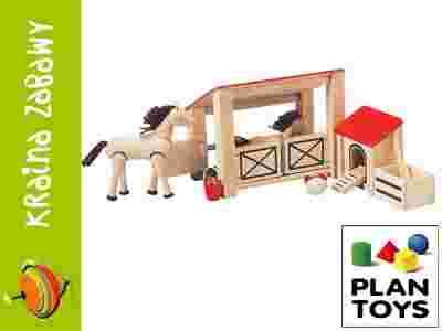 Stajnia dla koni i kurnik to doskonały zestaw drewnianych zabawek, który świetnie komponuje się z serią drewnianych domków Plan Toys, ale moze również stanowić niezesolony komplet do zabawy. W skład zestawu wchodzą dwa budynki: stajnia dla koni i kurnik. Ponadto znajdziesz tu klacz i źrebaczka oraz uroczą kokoszkę. Stajnia posiada otwierane drzwi, znajdujące się z boku i od frontu budynku. Do kurnika prowadzi "drabinka", ale wyposażono go także w otwierane drzwiczki z okienkiem. Wewnątrz kurnika znajdują się grzędy. Klacz ma ruchome nogi i głowę (na boki, w górę i dół), źrebaczek kręci głowa na boki. Wśród akcesoriów w zestawie znajduje się jeszcze skrzynia, wiadro i miotła.