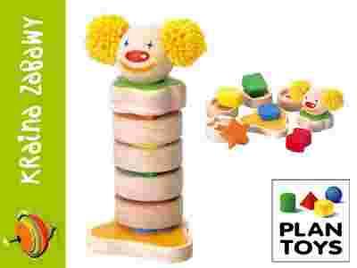 Drewniany, kolorowy Klown do sortowania to doskonała zabawka wpływająca na rozwój motoryczny dziecka, uczy rozpoznawania kształtów i kolorów, a także rozwiązywania problemów i logicznego myślenia. By zbudować zabawnego klowna dziecko musi dopasować kształty i kolory. Ułatwienie stanowią obrazki przedstawione na każdym krążku, pomiędzy który maluch wkłada klocek o odpowiednim kształcie. W zestawie znajdują się kolorowe klocki o różnych kształtach, krążki z odpowiednimi zagłębieniami, podstawa i krążek z uśmiechniętą głową klowna.