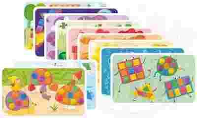 Do wyklejenia jest aż 14 kolorowych kart, na których dziecko według wzoru nakleja klocki PlayMais (dostępne oddzielnie)