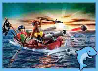 Pomóż piratom pokonać złego rekina, który przeszkadza im w kontynuacji rejsu. Zestaw jest doskonałą propozycją dla małych chłopców, którzy uwielbiają pirackie przygody i zawiera elementy niezbędne do zapoznania się z życiem piratów. W zestawie, oprócz dwóch figurek, znajduje się łódź piracka, rekin, armata z wyrzutnią kul oraz liczne pirackie akcesoria. Łącznie 25 elementów! Elementy zestawu są duże i bardzo wytrzymałe. Wykonano je z wysokiej jakości plastiku. Przeznaczony jest zgodnie z zaleceniami producenta dla dzieci z przedziału wiekowego 4-10 lat. Zestaw zapakowano w stylowe, tekturowe pudełeczko.
