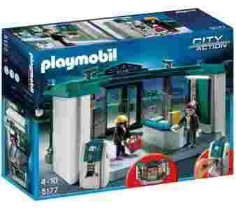 Duży i bardzo praktyczny zestaw PLAYMOBIL. W banku można ustawić bankomat, który naprawdę wydaje gotówkę po włożeniu karty bankomatowej. Jednak w tym banku nie jest tak bezpiecznie, ponieważ mimo wszelkich zabezpieczeń pewna pani postanowiła go obrobić.