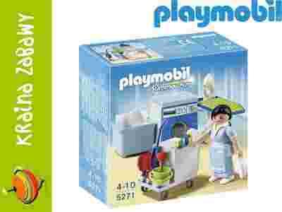 Serwis porządkowy 5271. Zestaw zawiera w pełni wyposażony wózek do sprzątania, z pralką i składaną deską do prasowania oraz figurkę Playmobil