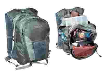 Bardzo pojemny plecak o dwukomorowej konstrukcji. Duża główna komora bez problemu zmieści nawet duże pudło np. model VS-3060, lub kilka mniejszych. W mniejszej komorze przedzielonej siatkową kieszenią zmieścimy aparat typu lustrzanka lub zapasowy kołowrotek plus sporo mniejszego sprzętu. Otwarte kieszenie po bokach plecaka znajdą zastosowanie do przechowywania napojów lub kanapek. Na górze znajduje się jeszcze zabezpieczona zamkiem niewielka kieszeń, mieszcząca portfel lub kartę wędkarską. Cześć tylna, przylegająca do pleców, jest jednocześnie dużą kieszenią zapinaną rzepem, zabezpieczoną dodatkowo specjalną gąbką, która ma duży wpływ na wygodę przy sporym obciążeniu komór i pełni funkcję wentylacyjną. Kieszeń przylegająca do pleców sprawdzi się w przechowywaniu płytkich pudełek typu „NS” lub lekkiej peleryny przeciwdeszczowej. Specjalnie wyprofilowane i regulowane szelki zintegrowane z częścią barkową zapewniają wygodę przy wielogodzinnym wędkowaniu bez zdejmowania plecaka. Na dole znajdziemy także regulowany pas z zatrzaskami, który zapobiega przesuwaniu się plecaka oraz po dwie opaski i linki z regulacją obwodu służące do zapięcia karimaty lub kurtki.