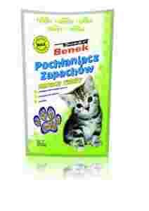 Pochłaniacz zapachów Super Benek wspomaga działanie żwirków higienicznych całkowicie neutralizując nieprzyjemne zapachy. Ogranicza rozwój bakterii i grzybów zapewniając czystość i higienę kociej toalety. Może być stosowany w kombinacju ze wszystkimi rodzajami żwirków podnosząc ich wydajność. Szczególnie polecany w połączeniu z Super Pinio Kruszon Zbrylający. Pochłaniacz pozostawia przyjemny zapach świeżej trawy, bardzo lubiany przez koty. Skutecznie zapobiega przywieraniu żwirku do dna kuwety. Stosowanie poza kocią toaletą doskonale wiąże płyny, likwiduje nieczystości i niepożądane zapachy.