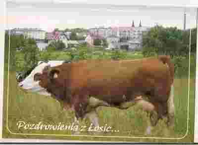 pocztówka ŁOSICE Panorama miasta i krowa