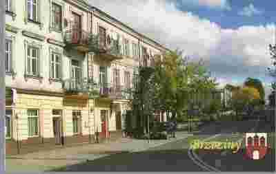 pocztówka BRZEZINY ulica Sienkiewicza HERB