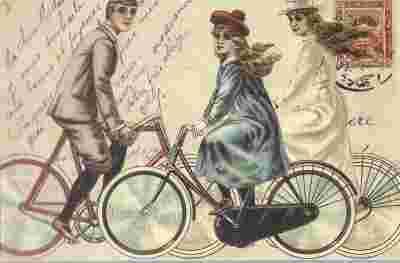 pocztówka CYKLIŚCI rowery retro kolaż