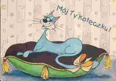 pocztówka KOTKA NA PODUSZCE bajkowa grafika