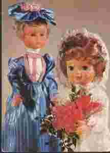pocztówka LALKI W STYLOWYCH STROJACH - KAW 1984