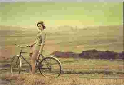 pocztówka ROWER I DZIEWCZYNA pejzaż