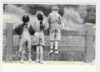 Pocztówka - Troje dzieci na mostku w parku ...