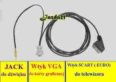 Kolor wtyku vga - (szary lub czarny)(styki złote lub srebrne), który włączamy do karty graficznej komputera, z drugiej strony mamy wtyczkę SCART (popularne EUROzłącze), którą wpinamy do telewizora.Jest też wtyk JACK do podłączenia do karty dźwiękowej w komputerze.