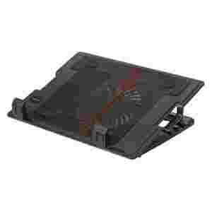 Materiał: metalowa obudowa wentylatora, plastikowa pokrywa, 4 antypoślizgowe gumki, Wymiary (szer. /gł. /wys.): 370 X 265 X58mm Wymiary wentylatora: (szer. /gł. /wys.): 140 x 140 x 15mm Stopień nachylenia: 6,5 - 45 stopni Wymiary wentylatora: 140mm Prędkość obrotowa: 1000 ± 10% obrotów na minutę Głośność wentylatora: 15dBA (Min) Długość życia wentylatora: 40 000 godzin Kompatybilność: od 9 do 17" netbook/ laptop, w tym także panoramiczny Napięcie znamionowe: 5VCD Prąd znamionowy: 0.25A Zasilanie: USB, długość kabla 550mm Porty USB: 2 USB Hub Kolor: czarny Waga: 730g