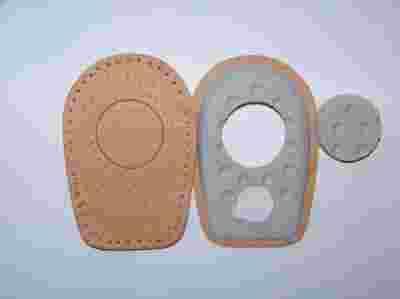 Podpiętki na ostrogi piętowe . Przeznaczone dla osób zwalczających dolegliwości pięty wywołane ostrogą kości piętowej. Znajdujązastosowanie w profilaktyce i rehabilitacji przy jużistniejących lub powstającychostrogach kości piętowych. Wyciągnięcie krążka tworzy strefę zabezpieczającą bolesną ostrogę przed uciskiem.Podpiętki amortyzują także piętę i minimalizują mikrowstrząsy powstające w czasie jej zetknięcia z twardym podłożem.Wyścielają część piętową buta, przez co reguluje wysokość piętyw obuwiu. Podpiętki wykonano ze skóry i pianki lateksowej. Rozmiary: od 35-37, 38-40, 41-43, 44-46 CENA ZA DWIE PARY
