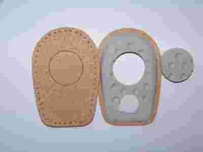 Podpiętki na ostrogi piętowe . Przeznaczone dla osób zwalczających dolegliwości pięty wywołane ostrogą kości piętowej. Znajdujązastosowanie w profilaktyce i rehabilitacji przy jużistniejących lub powstającychostrogach kości piętowych. Wyciągnięcie krążka tworzy strefę zabezpieczającą bolesną ostrogę przed uciskiem.Podpiętki amortyzują także piętę i minimalizują mikrowstrząsy powstające w czasie jej zetknięcia z twardym podłożem.Wyścielają część piętową buta, przez co reguluje wysokość piętyw obuwiu. Podpiętki wykonano ze skóry i pianki lateksowej. Rozmiary: od 35-37, 38-40, 41-43, 44-46 CENA ZA DWIE PARY