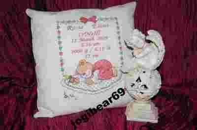 Pokazana poduszeczka przeznaczona jest i dla chłopca i dla dziewczynki.Wystarczy ze napiszesz ze tekst haftowany ma być koloru niebieskiego , fioletowego.......itp.