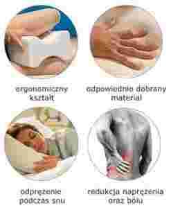 Poduszka odciążająca kręgosłup, stawy biodrowe i obolałe nogi zalecana zarówno przy siedzącym trybie życia, jak i pracy na stojąco, polecana jest także osobom starszym ze schorzeniami układu kostnego oraz kobietom w ciąży. Zaleca się odpoczynek z poduszką ułożoną między kolanami. Odciąża mięśnie oraz stawy dając im relaks i odprężenie, przez co pomaga zredukować napięcie, ból i zmęczenie. Dzięki włożeniu pomiędzy kolana wymusza optymalne ułożenie kręgosłupa do pozycji, w której może odpocząć po trudach dnia. Poduszka wykonana jest z miękkiego tworzywa (nietoksyczne i antyalergiczne), tzw. pianki elastycznej zbliżonej do pianki termoelastyczną (memory foam).