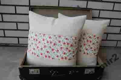 Poszewki "Wiosna w Prowansji" - Połączenie lnu w kolorze ecri i bawełny w delikatne różyczki. Kwiatowe wstawki "obramowane" z góry i dołu bawełnianą koronką. Poszewki utrzymane w prowansalskim stylu. Zapinane na zamek błyskawiczny. Przód i tył poduszki wygląda tak samo.