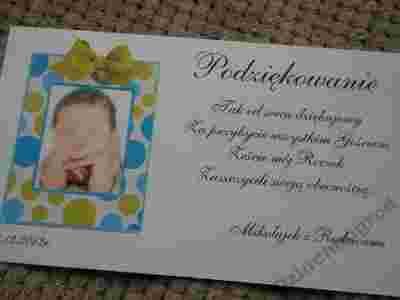 Na podziękowaniu drukujemy zdjęcie Dziecka z grafiką oraz tekst standardowy lub przesłany przez Państwa.