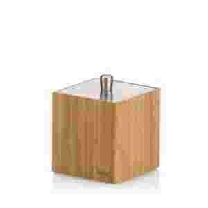 Korpus pojemnika na patki kosmetyczne wykonany z drewna bambusa, pokrywka ze stali szlachetnej.