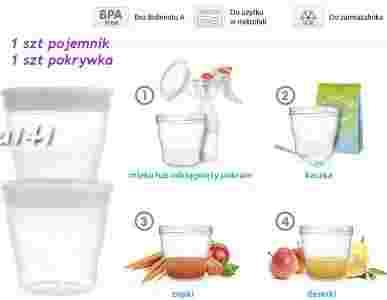 Pojemniki do przechowywania pokarmu pomogą Ciuporządkowaćzapasy mleka orazzaoszczędzić miejscezarówno w lodówce, jak i w zamrażarce. Umożliwiają długotrwałeutrzymanie najwyższej jakościprzechowywanych pokarmów. Wykonane zostały z materiału przeznaczonego do kontaktu z żywnością.