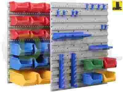 Zestaw pojemników i wieszaków na narzędzia. Zawiera dwie tablice naścienne, pojemniki magazynowe, haczyki, półki i wieszaki na narzędzia.
