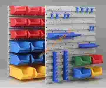 Pojemniki magazynowe + 2 tablice + uchwyty na narzędzia