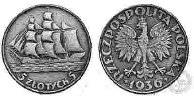 Polska - 5 Zlotych 1936 - Żaglowiec