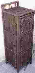 Przedmiotem aukcji jest komoda wykonana z taśmy wiklinowej na drewnianym stelażu. Tył szafki nie jest wypleciony taśmą.