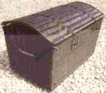Przedmiotem aukcji jest kufer - skrzynia, wyrób bejcowany i lakierowany.Kufer nie posiada wewnątrz obszycia , wieko kosza na drucianych zawiasach.